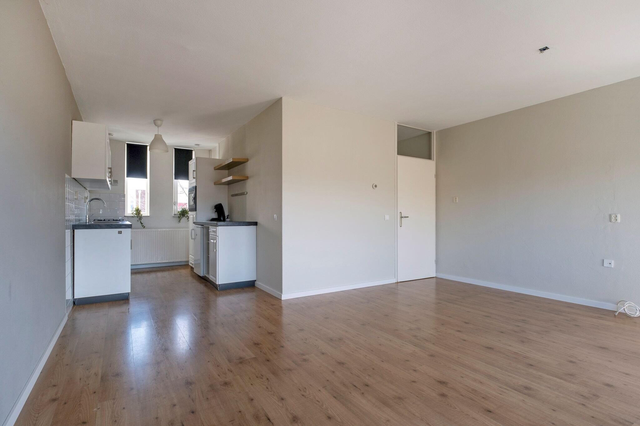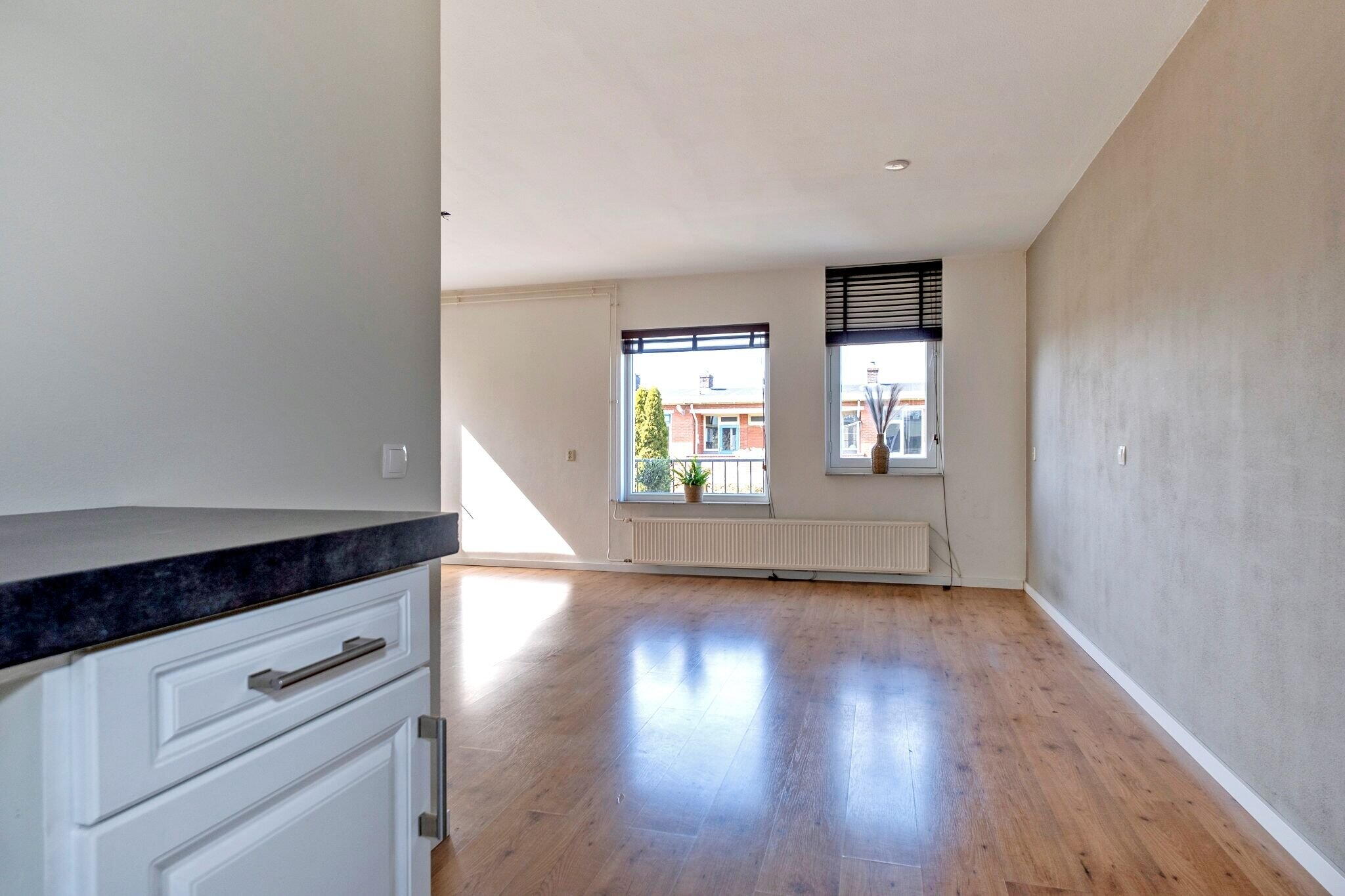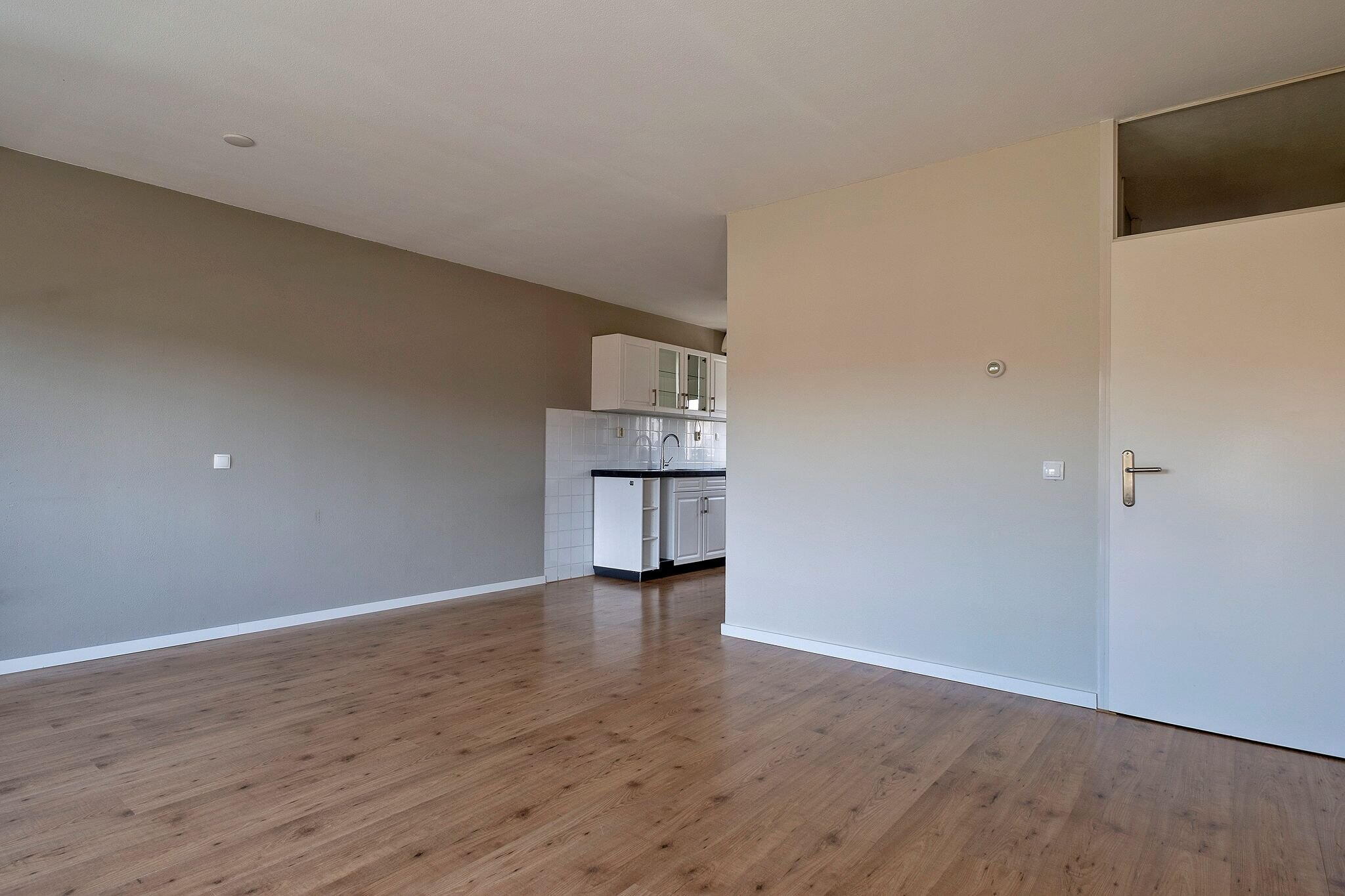 De lichte woonkamer (ca. 22 m²) is voorzien van een laminaatvloer en heeft een open keuken aan de voorzijde van het appartement;