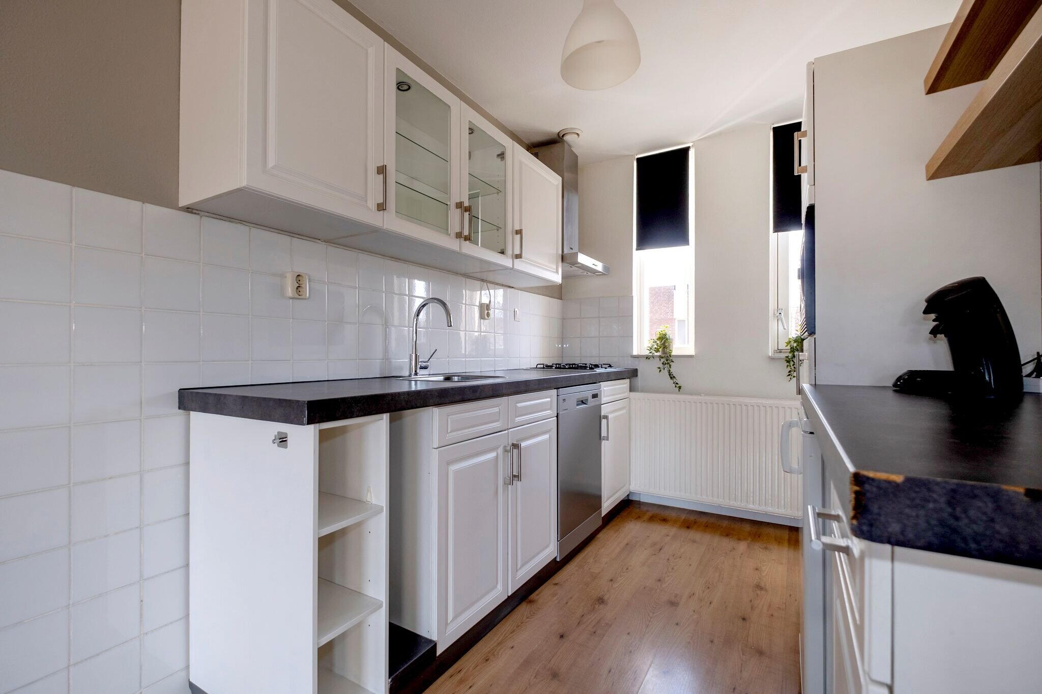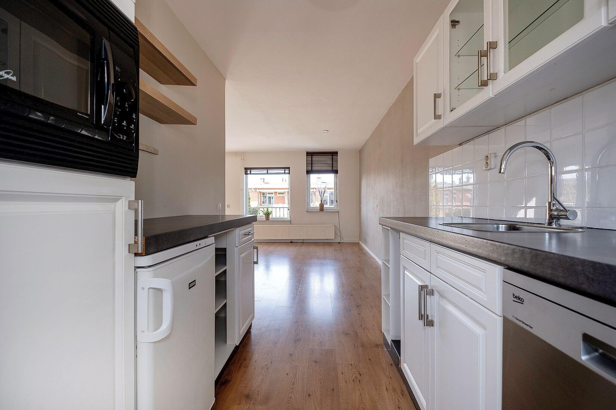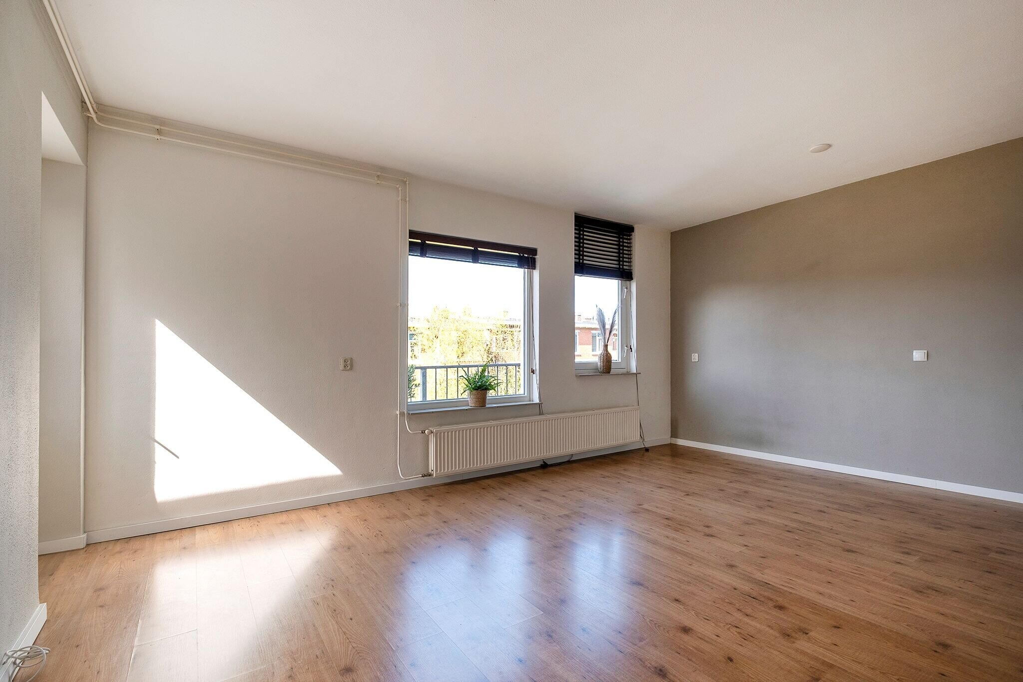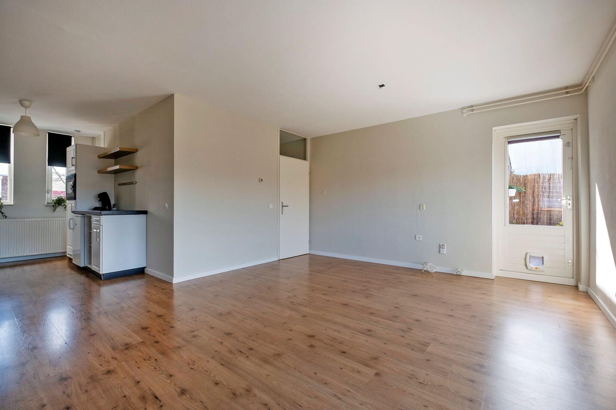 De lichte woonkamer (ca. 22 m²) is voorzien van een laminaatvloer en heeft een open keuken aan de voorzijde van het appartement;