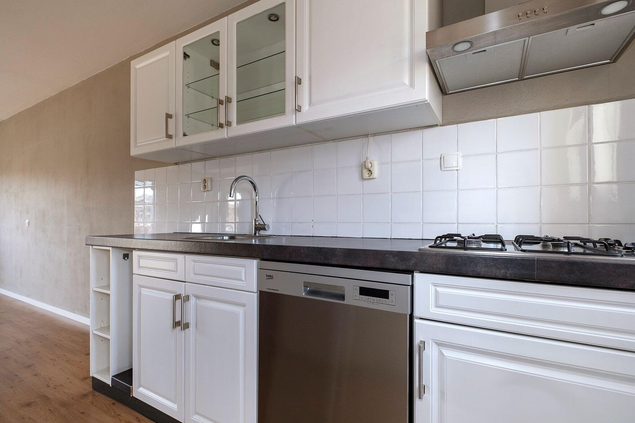 Deze keuken is uitgerust met een 4-pits gaskookplaat, afzuigkap, oven, vaatwasser, vriezer (3 lades) en koelkast en biedt toegang tot de cv-ruimte;
