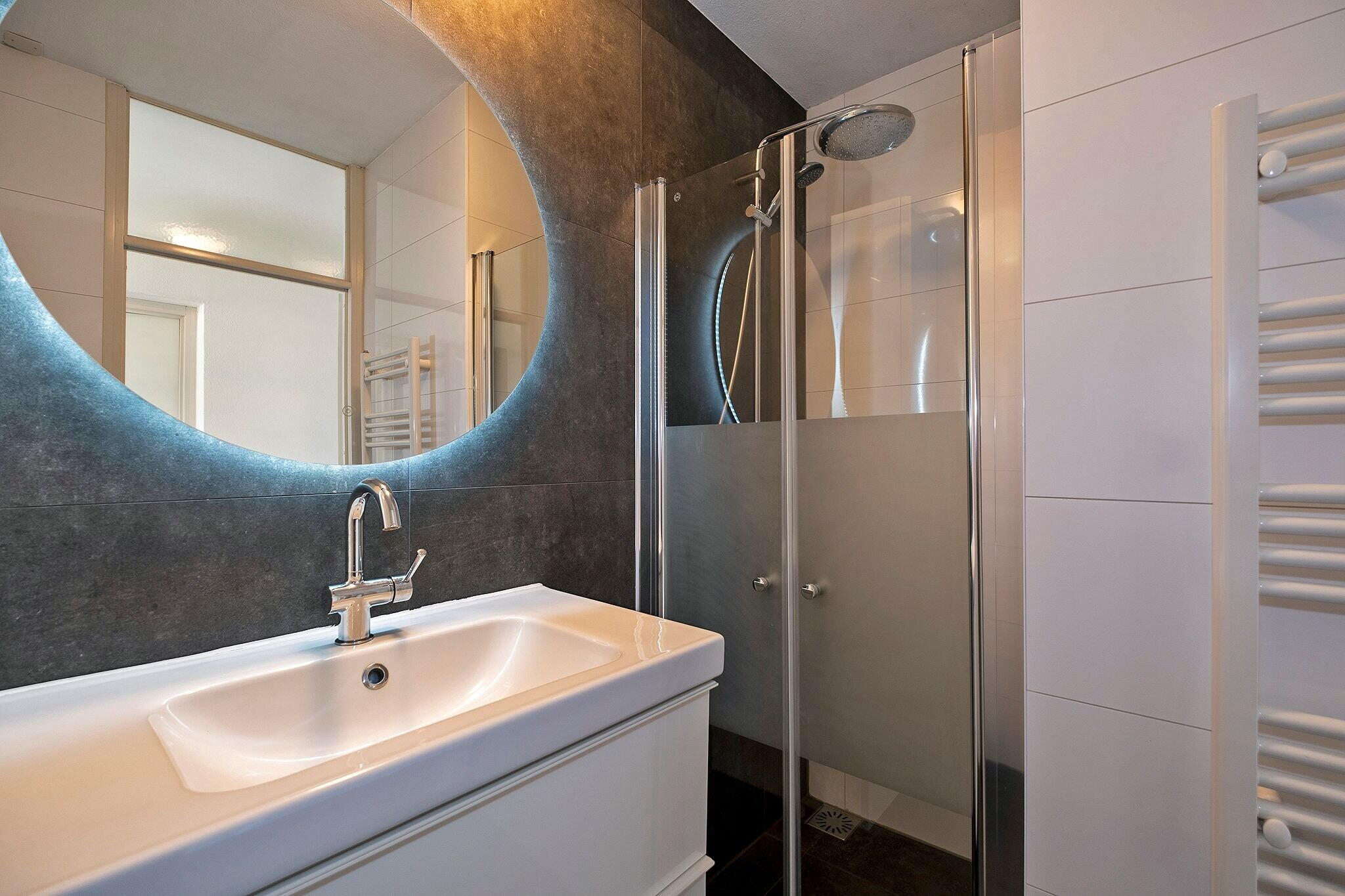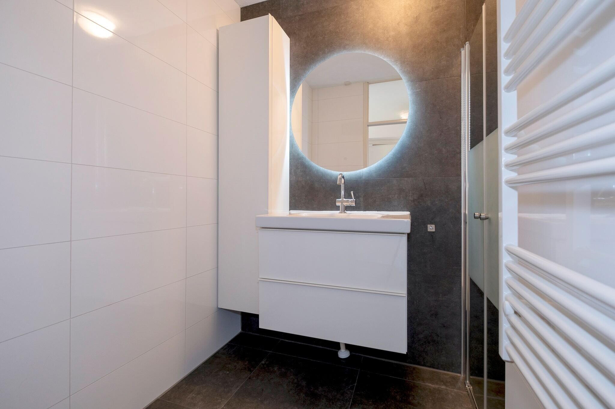 Badkamer (ca. 3m²) met elektrische verwarming, wasmeubel, douche en wasmachineaansluiting;